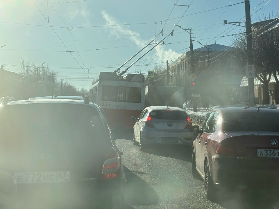 Троллейбусы с трудом объезжают место аварии, устроившей затор в Промышленном районе Смоленска