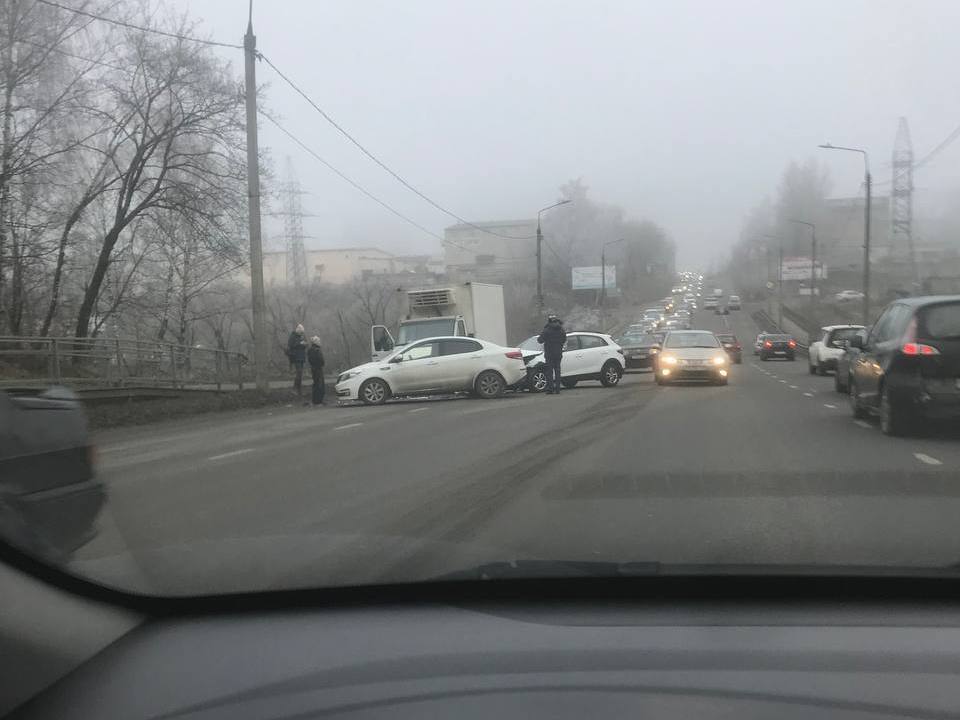 Смоленск, 20 декабря. Автомобильная авария перекрыла обе полосы улицы Крупской на въезде в город по Рославльскому шоссе Смоленска.