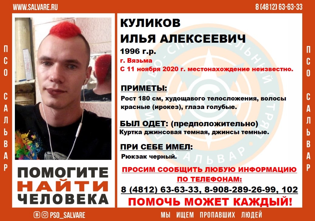 В числе примет молодого человека — необычная причёска, которую он сделал в начале ноября. Действующий в Смоленской области поисково-спасательный отряд «Сальвар» распространил в Сети ориентировку.
