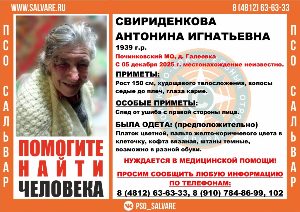 В смоленском поисково-спасательном отряде «Сальвар» уточнили, что Антонина Игнатьевна Свириденкова ушла из дома в неизвестном направлении вчера, 5 декабря. Ранее был объявлен срочный сбор волонтёров для поисков 86-летней пенсионерки.