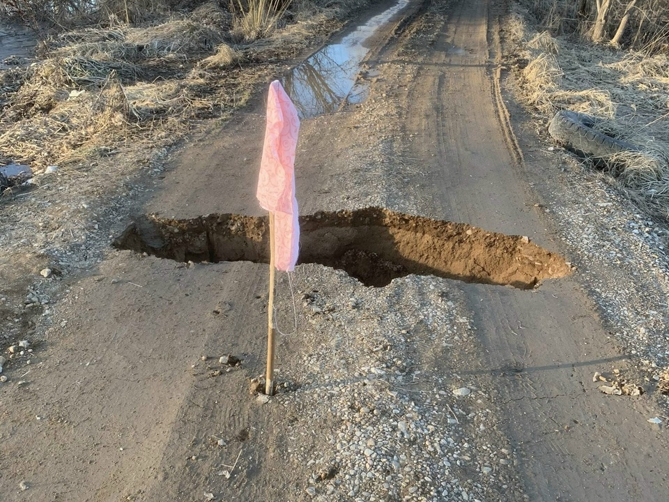 Дорога провалилась возле вкопаной два года назад трубы, сообщил в соцсети местный житель. По его словам, яма образовалась пока с одной стороны, но уже пошли трещины.