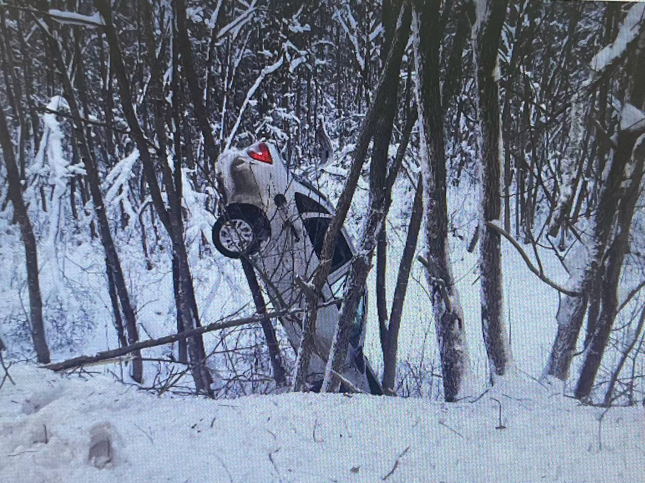 Опрокинувшись, «Лада» застряла между деревьев под Смоленском