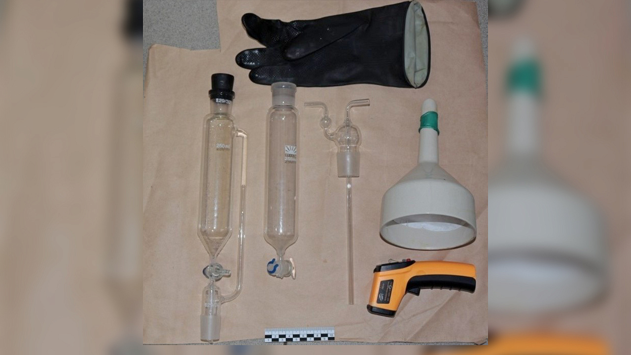 Подозреваемого задержали у него дома, где при обыске обнаружили и изъяли различное оборудование, химические реактивы и ёмкости, которые, предположительно, использовались в нелегальной деятельности.