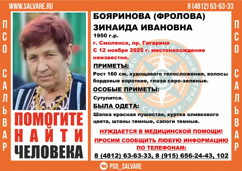 Смоленск, 13 ноября. В Смоленске объявили поиски 75-летней местной жительницы Зинаиды Бояриновой(Фроловой).