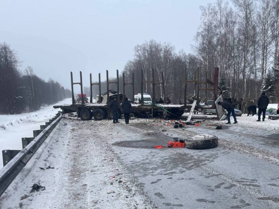 Смоленские пожарные спасли зажатого в искорёженном лесовозе водителя. Сотрудники ГАИ регулируют движение по межрегиональной трассе