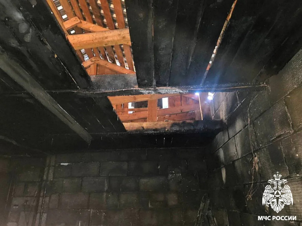 В результате стихия повредила потолочное перекрытие, а строение полностью закоптило дымом.