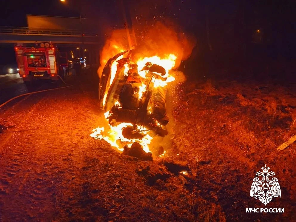 Легковой автомобиль на полной скорости врезался в столб и воспламенился.