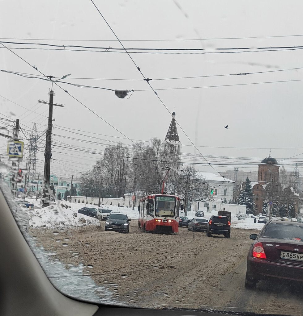 Инцидент произошел сегодня, 28 января, в обеденный час-пик на улице Кашена, у Смоленского автовокзала. Трамвай занесло, он сошел с рельсов.