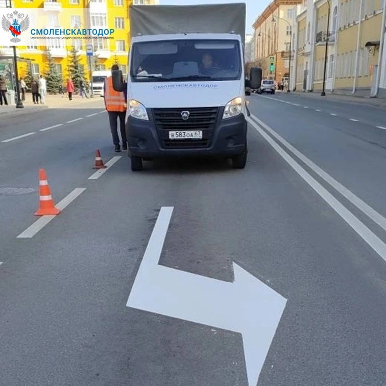 Смоленск, 3 апреля. Специалисты «Смоленскавтодора» нанесли новую разметку на улице Дзержинского.
