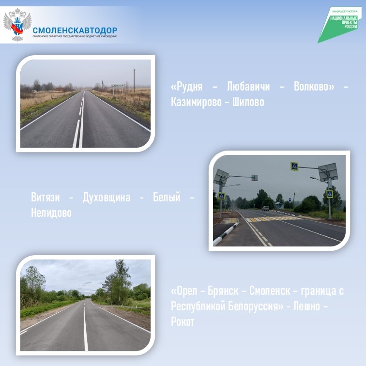 - «Орел – Брянск – Смоленск – граница с Республикой Белоруссия» — Лешно – Рокот (6,6км). На данных участках работы полностью завершены. На объектах был выполнен ряд работ, направленный на улучшение проезжей и пешеходной части: устройство выравнивающего и верхнего слоя, устройство тротуаров и посадочных площадок, установка системы АСО на пешеходных переходах, нанесение дорожной разметки и монтаж знаков.