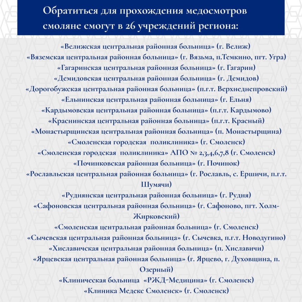 Появился полный список учреждений, где смоляне смогут бесплатно пройти медицинские осмотры