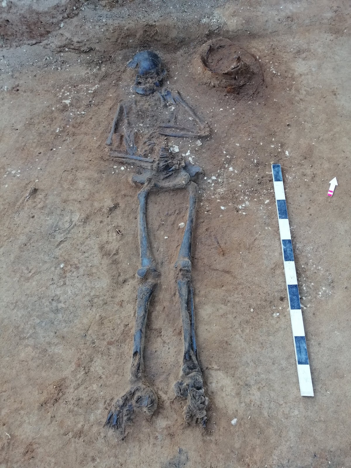 «Это оказалась погребальная камера размером 3 х 2,8 м в гравийном плотном грунте. Такой грунт очень тяжело копать даже современными железными лопатами и кирками, что уж говорить о конце X века. Камера была неглубокая. В ней лежал хорошо сохранившийся скелет мужчины ростом 176 см, ориентированный на северо-запад. При нем было копье-пика тип 5 по А. Н. Кирпичникову (всего 18 см). Оно стояло вертикально в углу камеры — видимо, древко было сломано. В головах погребенного было размещено деревянное ведро с железными обручами (хотелось бы верить, что с остатками пива). Справа почти под локтем — боевой топор 4 типа по А. Н. Кирпичникову, костяная орнаментированная пуговица, железный нож и очень маленький кусочек дирхема. Есть еще и странный цилиндр неясного назначения».