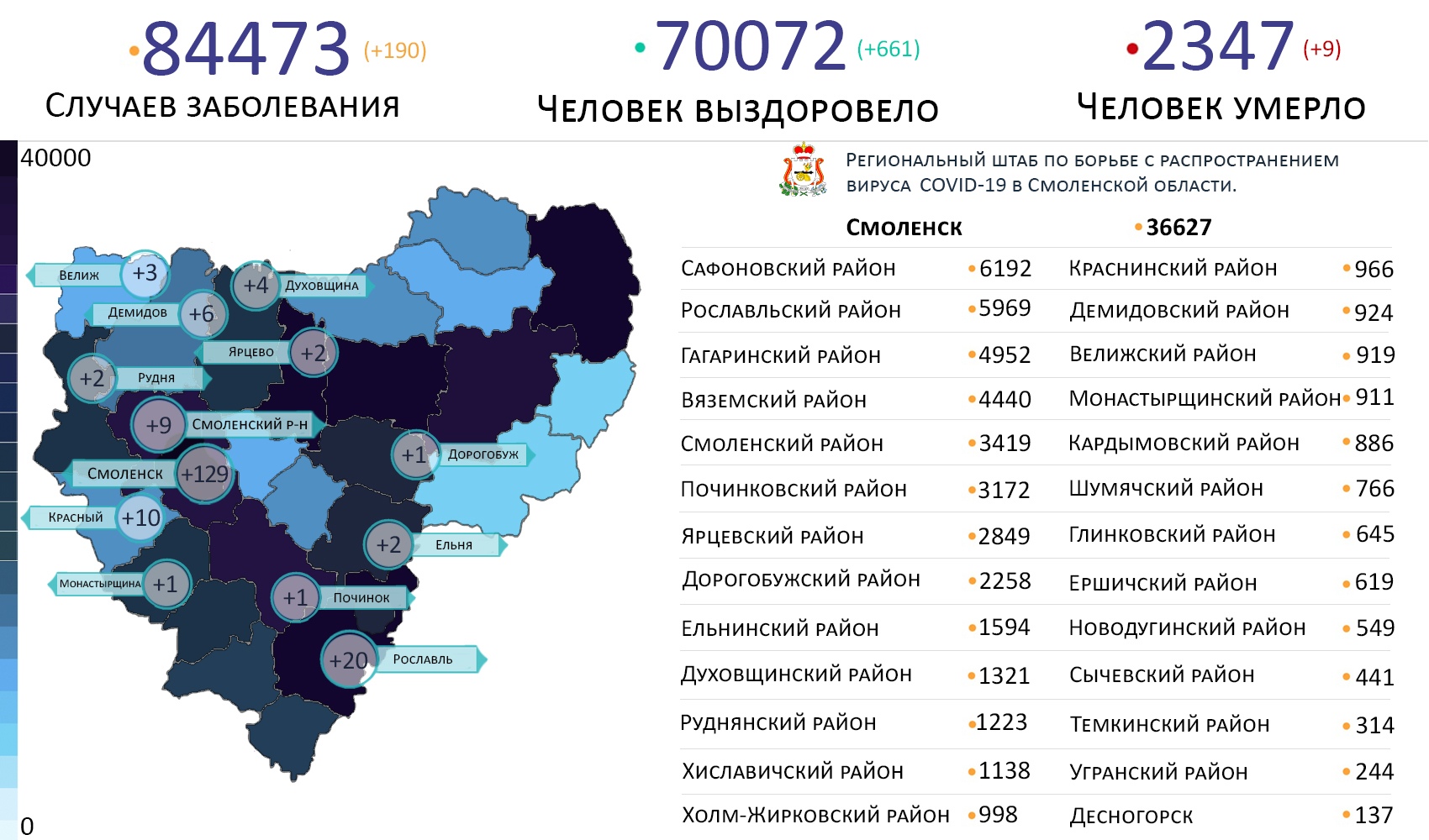 Из 190 новых положительных тестов на COVID-19 свыше 2/3, а именно 129, поступили из Смоленска, ещё 20 — из Рославльского района, сообщили smolensk-i.ru в областном оперативном штабе. Данные по другим муниципалитетам отображены на карте ниже.