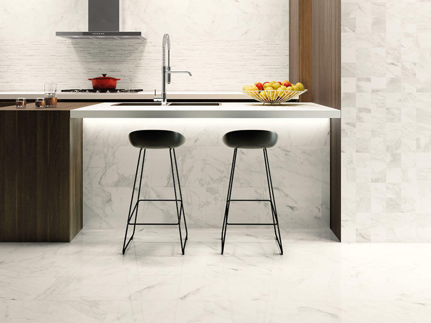 Керамогранит для кухни с имитацией камня можно использовать в таких стилях, как: минимализм, неоклассика и другие. Необычно и стильно смотрится сочетание плитки под камень на фартуке с плиткой под дерево на полу.