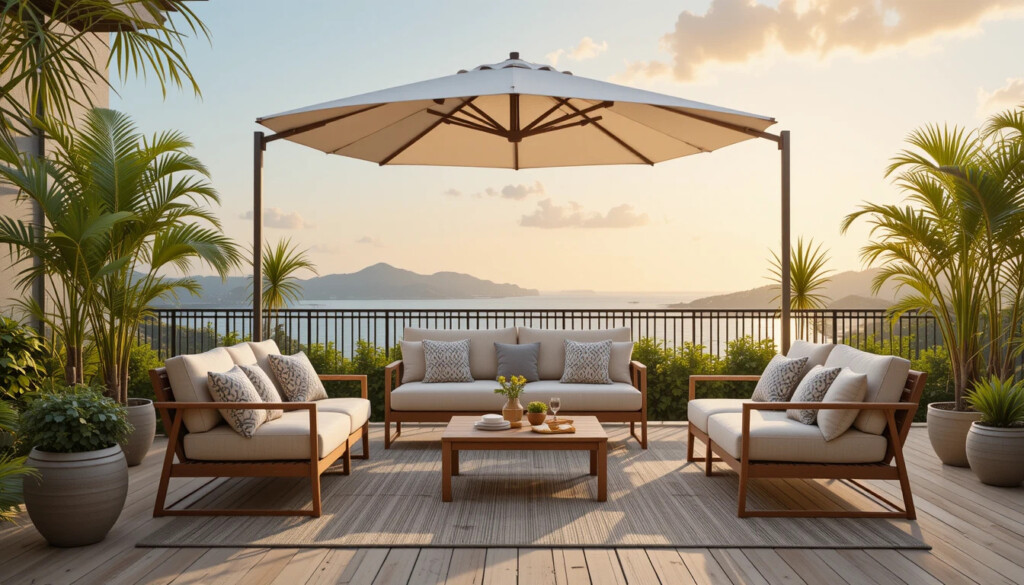 - Аксессуары. Зонты, уличные ковры и декоративные подушки, которые завершают образ и делают пространство еще более уютным.