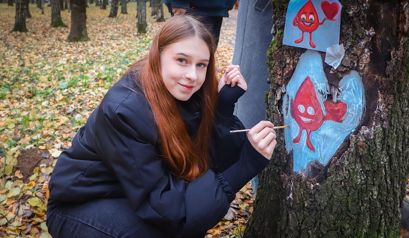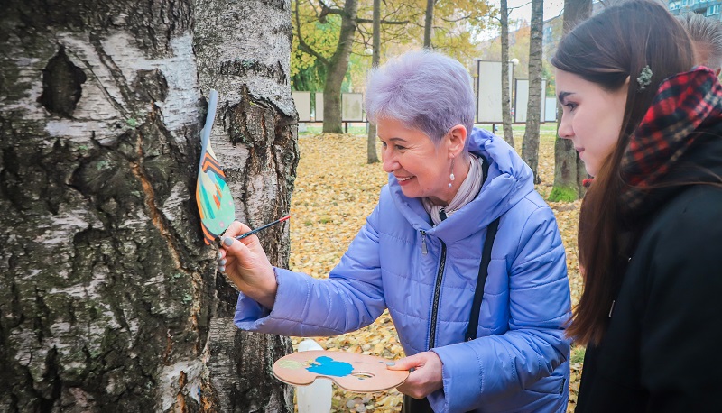 С помощью кистей и красок волонтеры превратили деревья с «лунками» на стволах в городском парке в яркие визуальные истории о главных социальных проектах города: донорстве, экологии, патриотизме, инклюзии, помощи детям и зооволонтерству