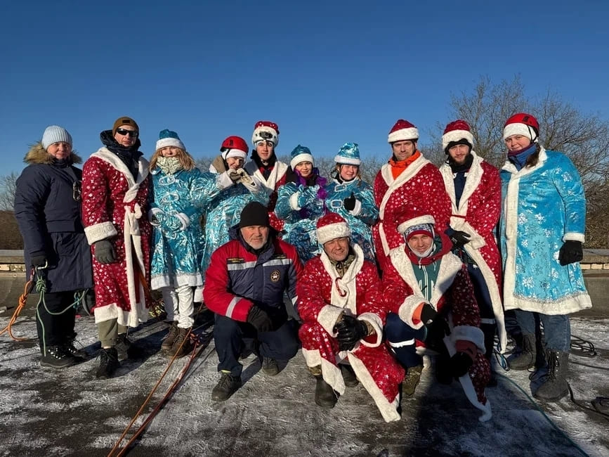 Смоленск, 2 января. Десант Дедов Морозов и Снегурочек «высадился» на крыше Рославльской ЦРБ, чтобы поздравить юных пациентов больницы с Новым годом.