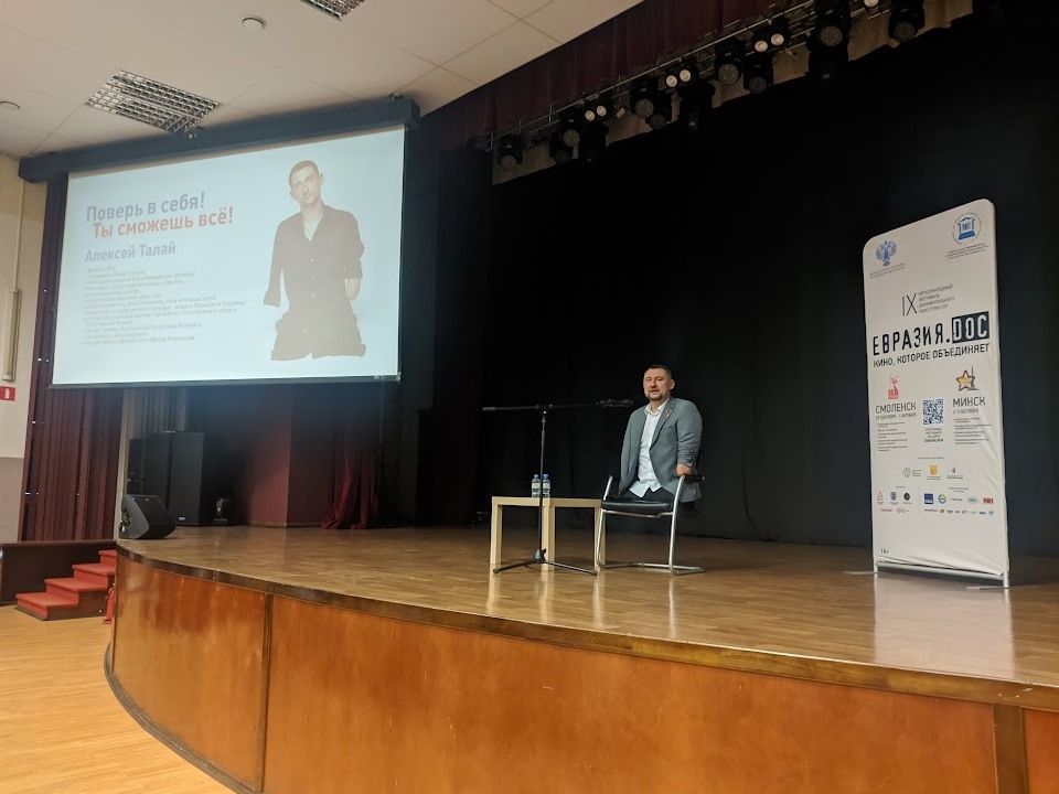Общение предварил показ биографического документального фильма «Птица Феникс Алексея Талая» о непростой судьбе уроженца соседней со Смоленском Орши, который, несмотря на пережитое, смог найти в себе силы и стать выдающимся спортсменом, поставившим немало рекордов в паралимпийском плавании, а также успешным коммерсантом, мотиватором и, в последние годы, гуманитарным послом, за что президент России Владимир Путин наградил его Орденом Дружбы.