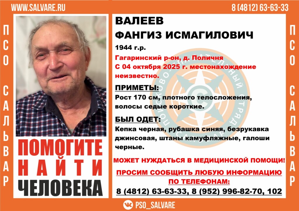 Смоленск, 4 октября. В Гагаринском районе пропал 81-летний Фангиз Валеев.