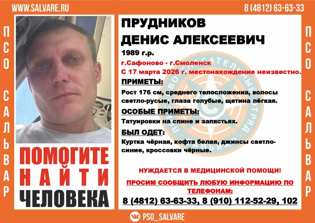 Смоленск, 21 марта. В Смоленской области объявили поиски 37-летнего жителя Сафонова Дениса Прудникова.