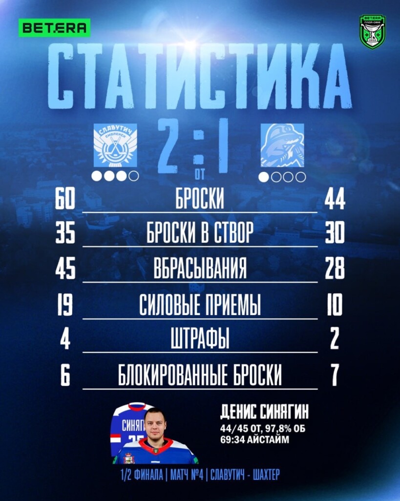 Смоленск, 7 апреля. Смоленский хоккейный клуб «Славутич» в четвёртом матче 1/2 финала плей-офф белорусской экстралиги в овертайме вновь одолел солигорский «Шахтёр» (2:1 ОТ).
