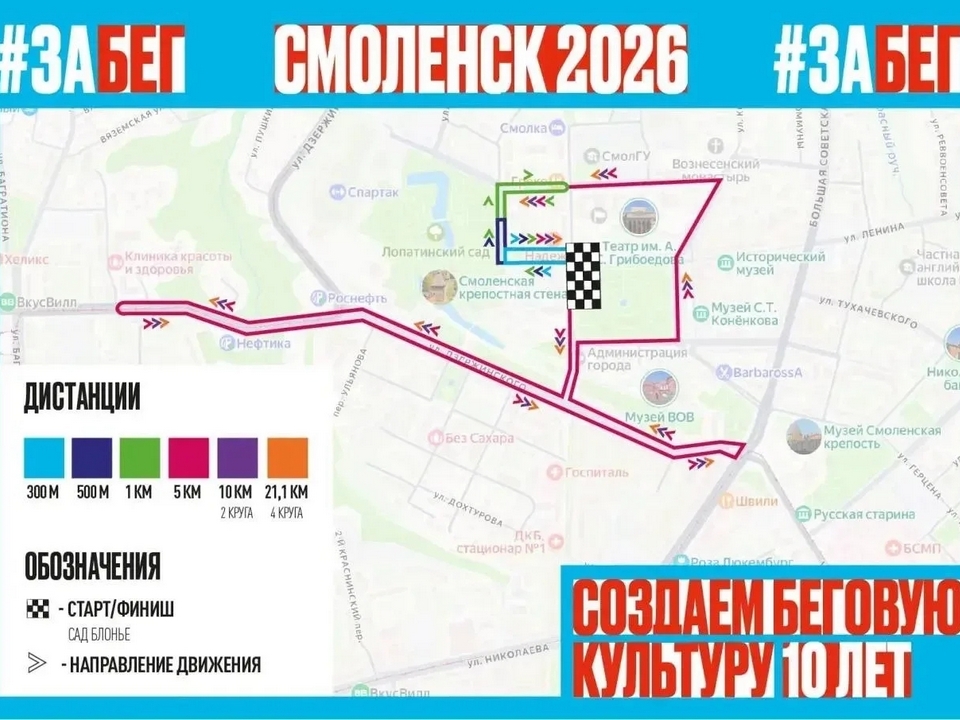 Смоленск, 30 апреля. Юбилейный 10-й по счёту полумарафон «ЗаБег.РФ» состоится 23 числа следующего месяца на площади Ленина в Смоленске.