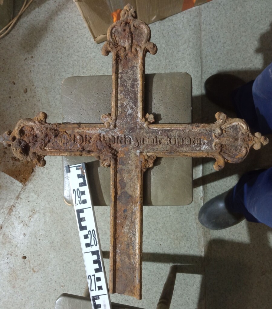 Как сообщает Смоленская экспедиция ИА РАН, на чугунном кресте были обнаружены надписи в готическом стиле. Эксперты предположили, что обломки надгробия происходят от Лютеранского кладбища, которое располагалось неподалеку, но было практически полностью ликвидировано в середине 20 века.