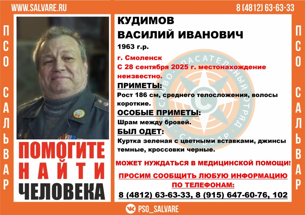 Смоленск, 3 октября. В Смоленске пропал 62-летний Василий Кудимов.