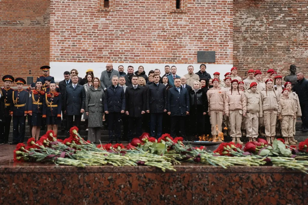 Смоленск, 8 апреля. Губернатор Василий Анохин вместе с Министром просвещения РФ Сергеем Кравцовым, Министром образования Республики Беларусь Андреем Иванцом, заместителем Государственного секретаря – членом Постоянного Комитета Союзного государства Алексеем Казаковым возложили цветы к Вечному огню в сквере Памяти Героев в Смоленске.