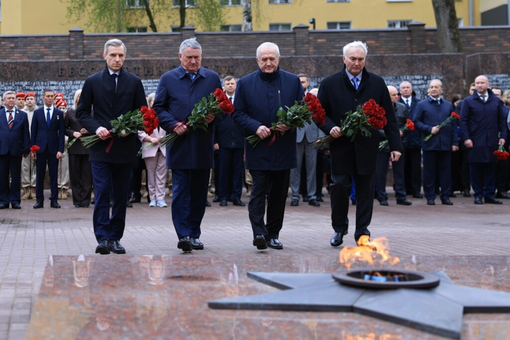 Смоленск, 17 апреля. Губернатор Смоленской области Василий Анохин и заместитель председателя Совета Федерации, Герой России, сенатор от Смоленской области Юрий Воробьёв возложили цветы к Вечному огню в сквере Памяти Героев в Смоленске.