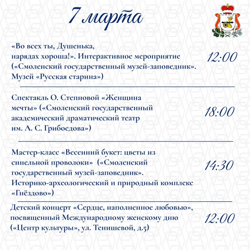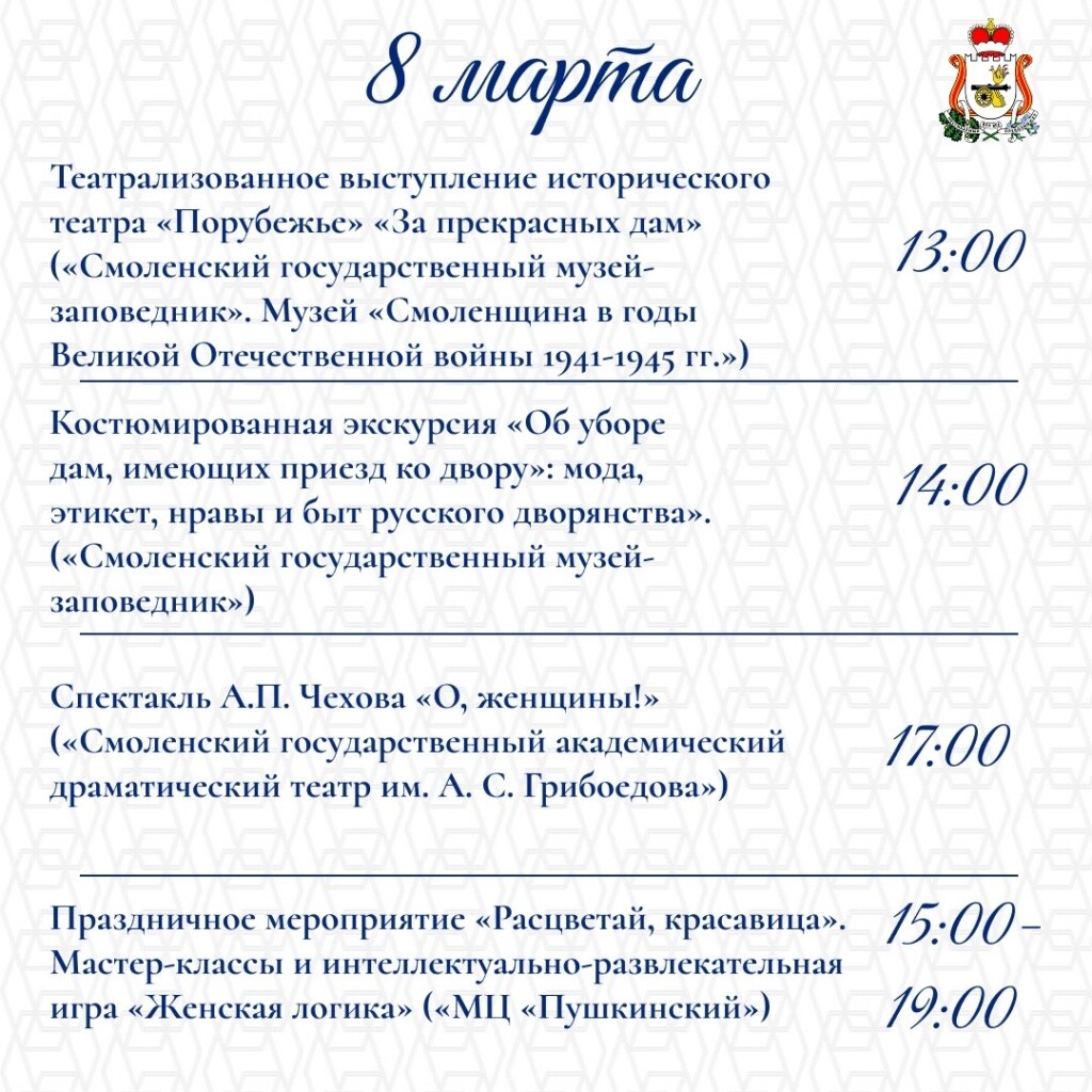 Смоленск, 6 марта. В Смоленской области пройдут мероприятия, посвящённые Международному женскому дню. Это спектакли, концертные программы, выставки, акции, экскурсии, интерактивные мероприятия.