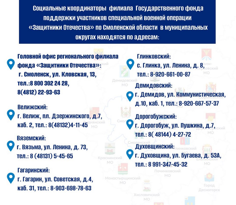 Отделение фонда «Защитники Отечества» в Смоленской области подготовило все адреса и контакты профильных работников